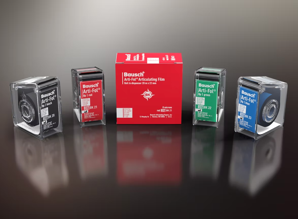 Bausch Arti-Fol® Occlusion films are especially suitable for representing static and dynamic occlusion in several colors. The first step is to inspect the static occlusion in red and the second step to inspect the dynamic occlusion in black. The color sequence can always be alternated. Several different colors can be used for a much more precise representation of dynamic occlusion. Bausch Arti-Fol® is available in four different colors. All films are available with double-sided color coating for the marking of antagonistic contacts.
