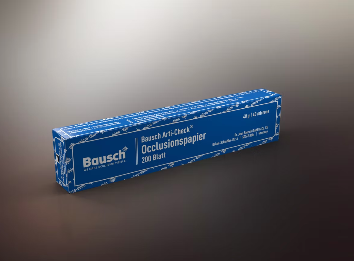 Bausch micro-thin Articulating Papers are especially suitable for the two-tone representation of static and dynamic occlusion. The first step is to inspect the static occlusion in red, and the second step to inspect the dynamic occlusion in blue. The color sequence can, of course, be altered.