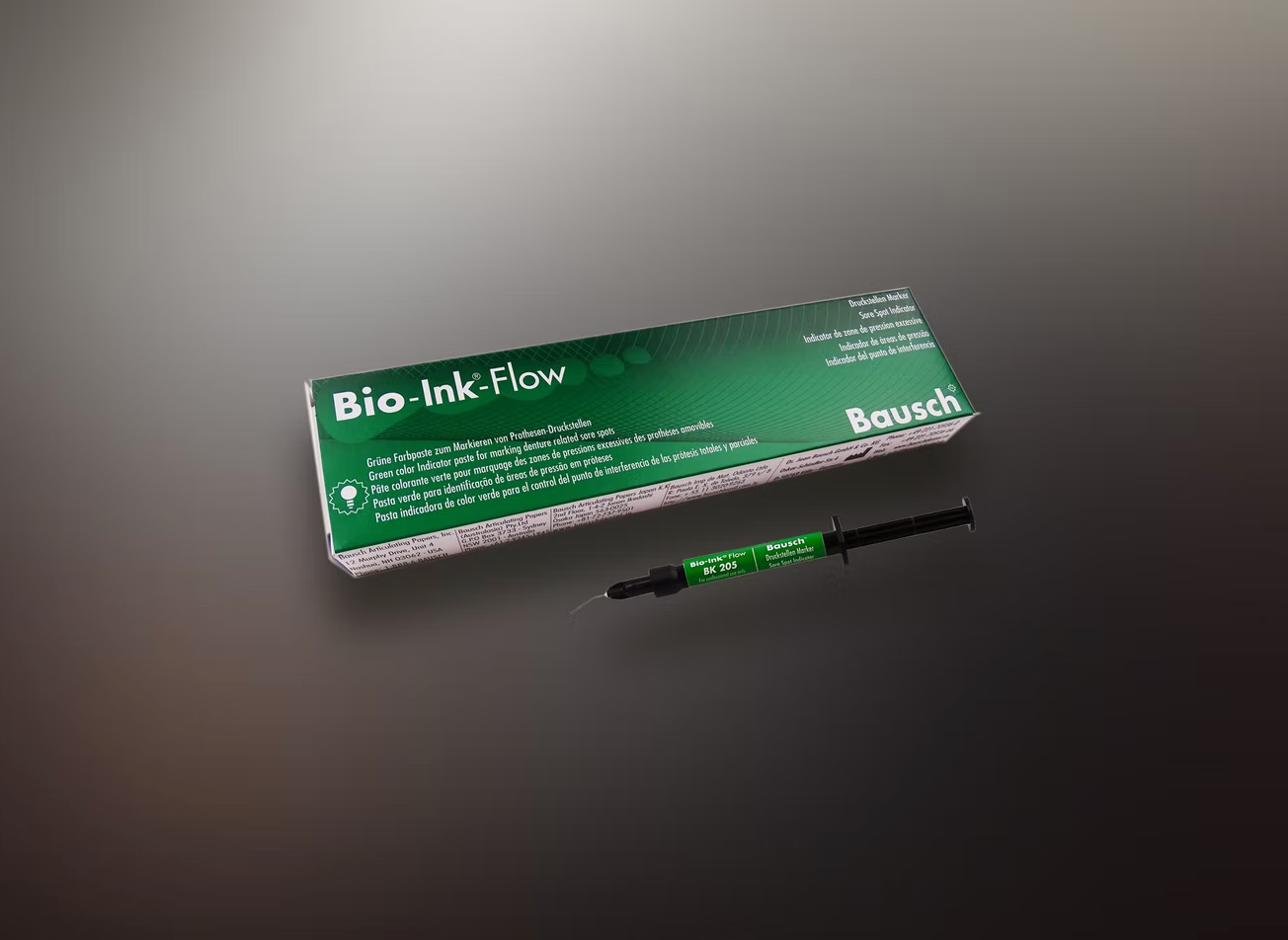 Bio-Ink®-Flow is intended for marking points, areas and lines on the oral mucosa, such as sore spots, AH-line and mucosal bands. The relevant areas are colored with Bio-Ink®-Flow on the previously dried mucosa. When the dried denture is inserted, the color which has been applied to the sore spot is being transferred. Subsequently, the removable restoration can be adjusted.