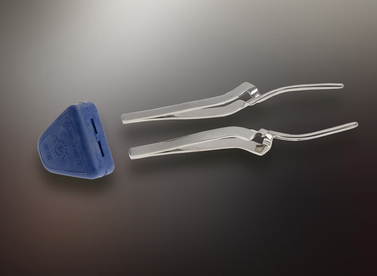 Our Flexible Bite Fork system comprises two curved forceps (BK 133) and a rubber handle (BK 130). The forceps are easily inserted into the rubber handle and can be moved. The bite fork is particularly suitable for holding the thinnest occlusion paper in the curve (BK 11 and BK 12) or for use with our 75 mm wide articulating film.